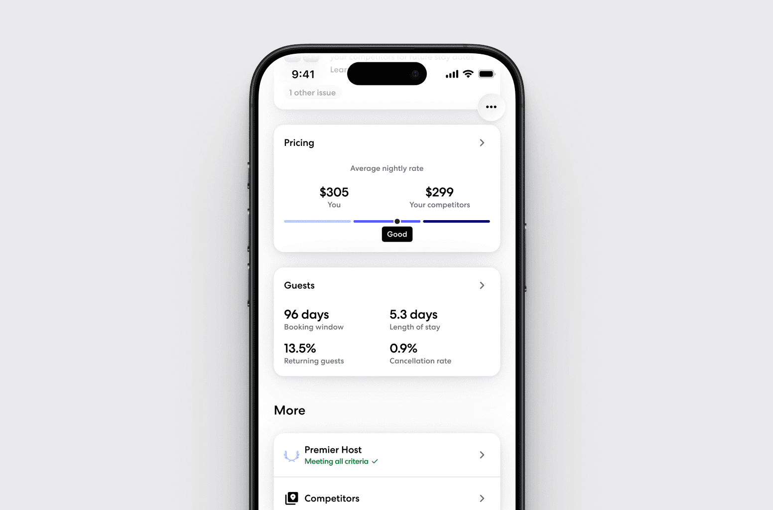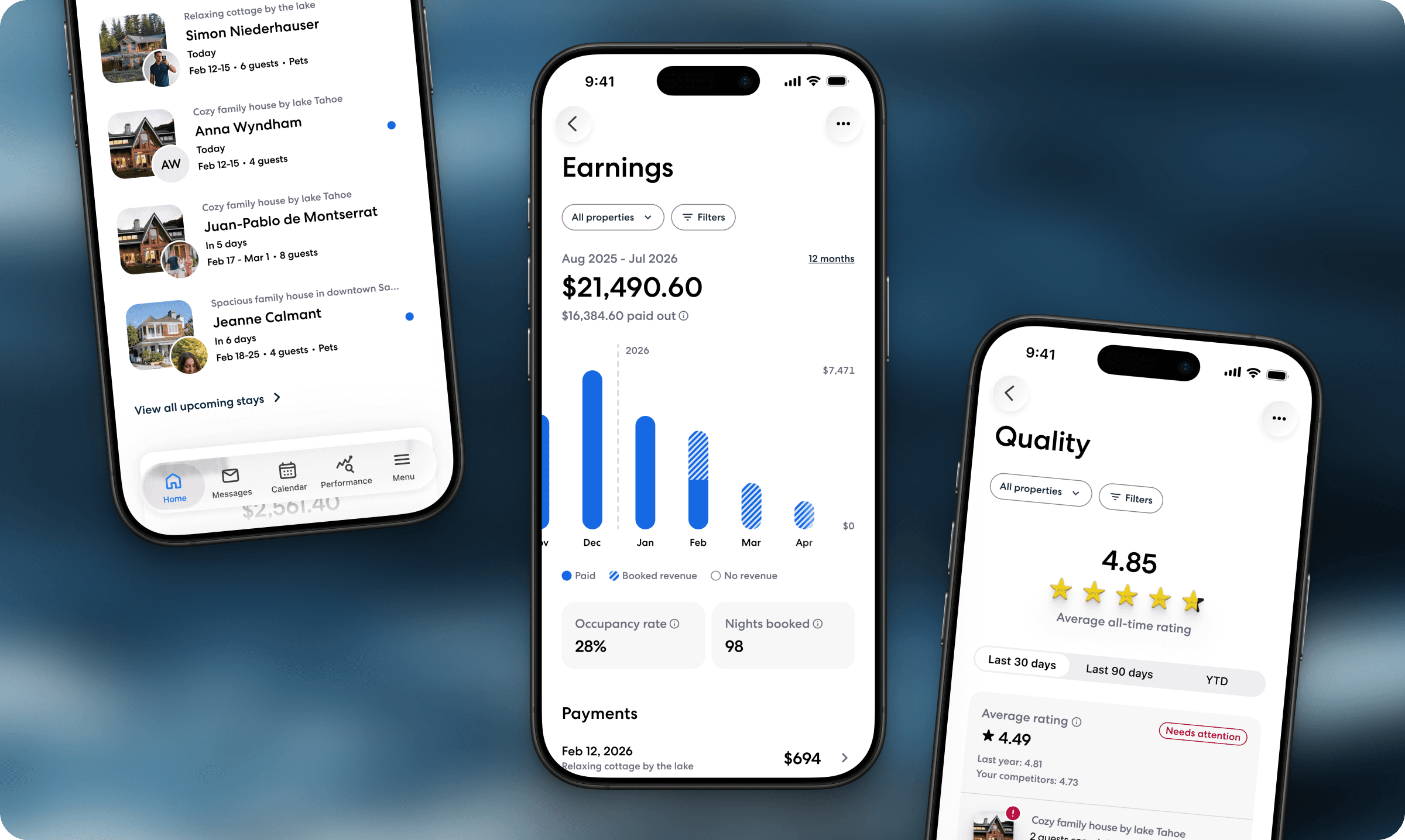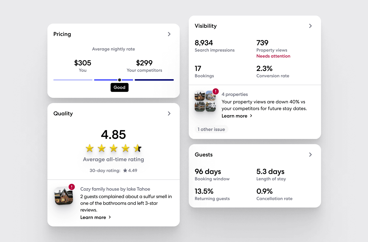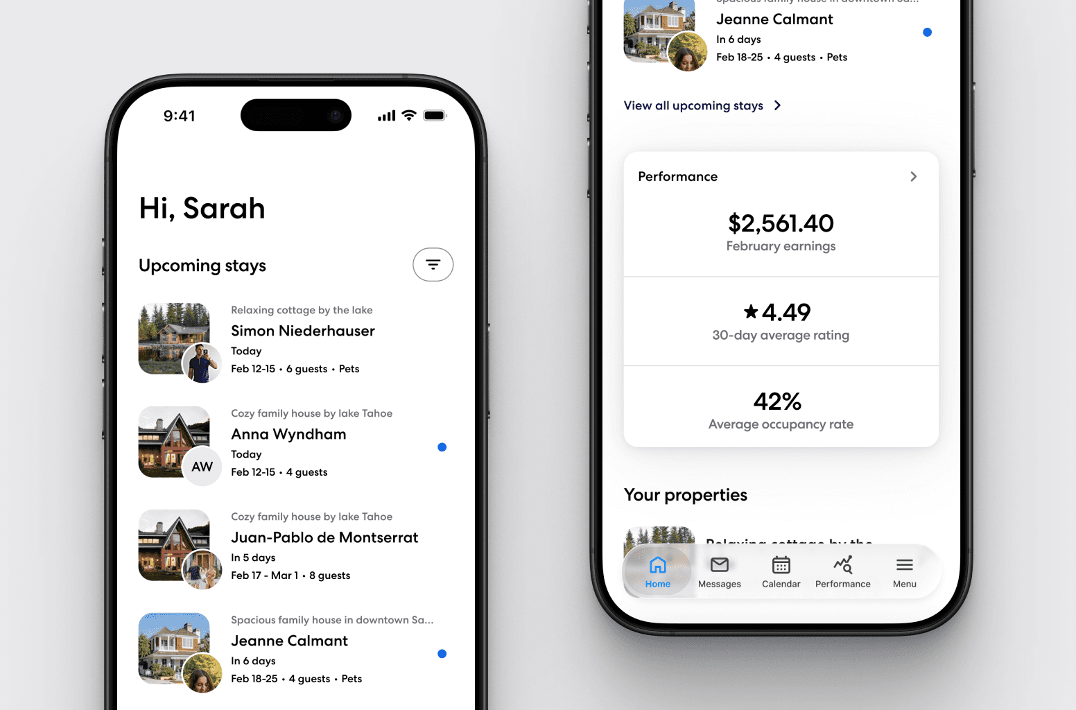 A completely reimagined homepage with the information users were expecting: upcoming stays, performance overview, and their properties.