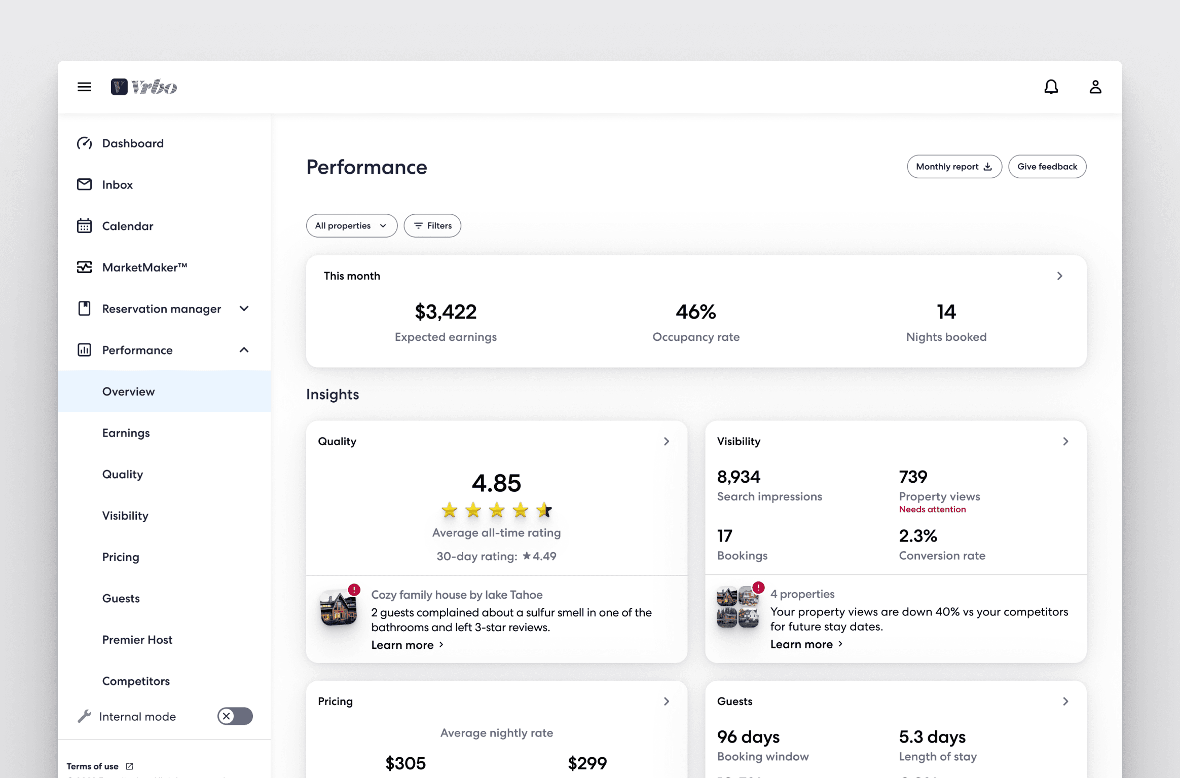 A centralized experience for owners to see their overall performance on Vrbo, with metrics divided by categories: quality, visibility, pricing, guests. View all your properties by default, and filter down by region, amenities, rooms and beds, and more.